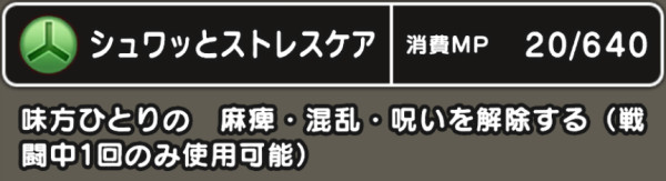 | 効果 | 味方ひとりの 麻痺・混乱・呪いを解除する (戦闘中1回のみ使用可能) |