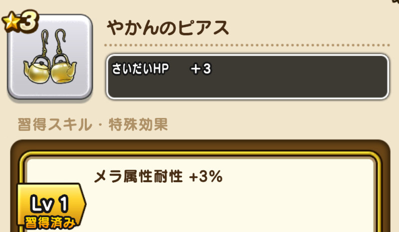 ドラクエウォークの防具「やかんのピアス」の評価や習得スキル・特殊効果をまとめています。