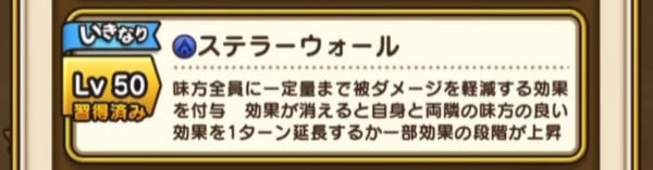 | Lv50 | ステラーウォール / 消費MP 最大MP2% 味方全員に一定量まで被ダメージを軽減する効果を付与 効果が消えると自身と両隣の味方の良い効果を1ターン延長するか一部効果の段階が上昇(効果ターン)【いきなり】 |