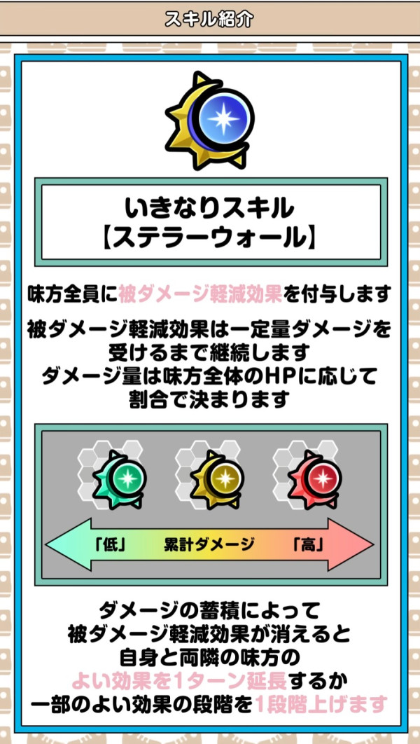 | ※蓄積される被ダメ累計は、味方全体で共通。 ※バリア解除に必要な被ダメ累計は味方全体の最大HP合計50%。 ※味方が受けたオーバーキル分もカウント対象。 ★最大HPを増加させるスキル効果は参照しない。 ※味方の戦闘不能、馬車の入れ替えは変動なし。 ※毒や感電、トラップ、反射、魅了や混乱などによる自傷ダメージは対象外。 ※複数キャラでステラーウォール使用時も効果は重複しない (1段階上昇orターン延長の対象キャラが増えるだけ) ※聖印状態でも1段階上昇できる(追加付与ではなく再変化扱い) ※1段階上昇とターン延長はクシャラミ共有の対象外 ※ステラーウォール自体のターン延長はできない |