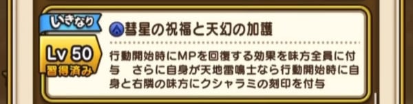 | Lv50 | 彗星の祝福と天幻の加護 / 消費MP 最大MP2% 行動開始時にMPを回復する効果を味方全員に付与 さらに自身が天地雷鳴士なら行動開始時に自身と右隣の味方にクシャラミの刻印を付与【いきなり】 |
