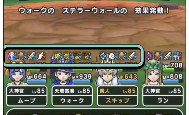 | ※自身が戦闘不能や「ふきとばし」等で離脱していた場合、ターン延長や段階の上昇は発動しない。 ※馬車で入れ替えしていた場合、発動しない。 ※「モシャス」使用時、追加で発動しない。 ※テンションや竜気などの段階は上がらない。 ※2段階→3段階には 限界突破の事前付与が必要 |