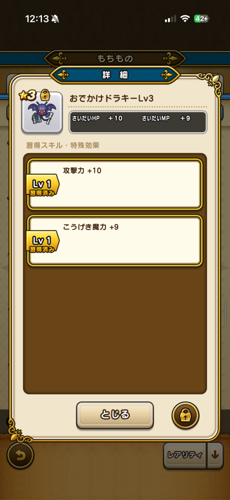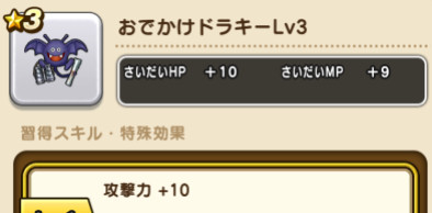ドラクエウォークの防具「おでかけドラキーLv3」の評価や習得スキル・特殊効果をまとめています。