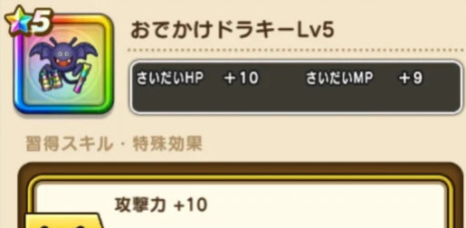 ドラクエウォークの防具「おでかけドラキーLv5」の評価や習得スキル・特殊効果をまとめています。