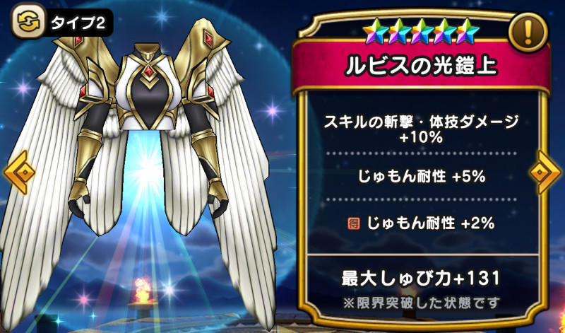 ドラクエウォークの防具「ルビスの光鎧上」の評価や習得スキル・特殊効果をまとめています。