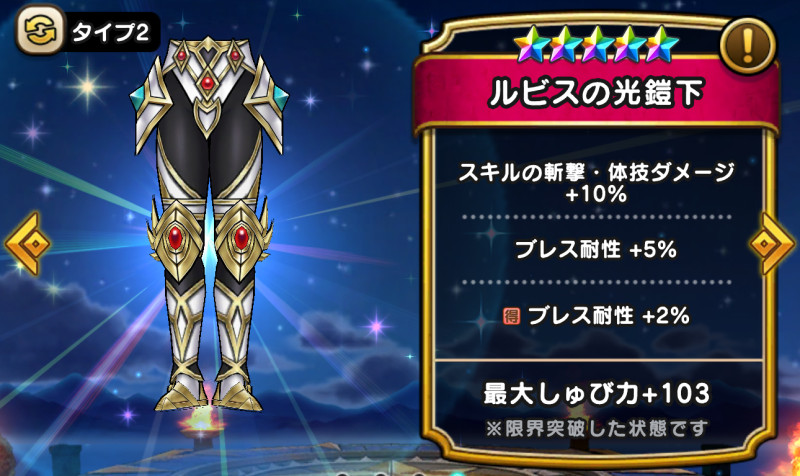 ドラクエウォークの防具「ルビスの光鎧下」の評価や習得スキル・特殊効果をまとめています。