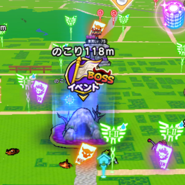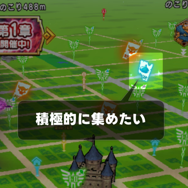 「ロトの子孫」のレベル上げをするために、「ふっかつのじゅもんの切れ端」を集める必要があります。こちらはフィールド上に落ちており、橙/紫/青のアイコンが目印です。