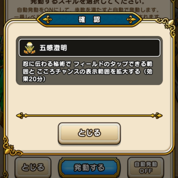 | ・フィールドのタップできる範囲を少し拡大 ・約10m ※五感澄明などと重複時は効果が高いスキルを適用 | ||