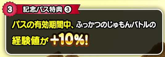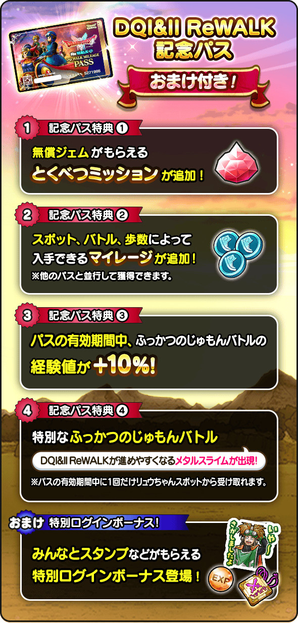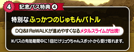 | 特典 | ①ふっかつのじゅもんバトルの経験値+10% ②ふっかつのじゅもんバトルにメタルスライム出現 ※パス有効期間中に1回だけ「リュウちゃん」スポットから受け取れる |