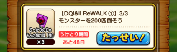 | モンスターを200匹倒そう | ふっかつのじゅもんの切れ端【強】×3 |