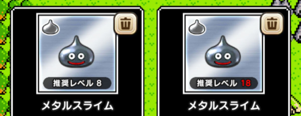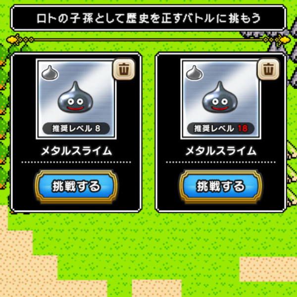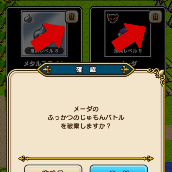 現時点でのレベル上限に達した後は、メタル系を中心に複数確保しておくと次の上限解放後に有利に進められます。また、ふっかつのじゅもんバトルは右上から削除することも可能です。