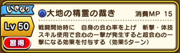 | 自身の会心率を上げ 会心の一撃発生率を1段階上げます。 有効ターン:5ターン (上昇する倍率は下記参照) 消費MP:15 |