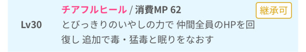 | まれにいきなりマホカンタ こころ最大コスト+4 じゅもんダメージ+3% デイン属性じゅもんダメージ+12% ザバ属性じゅもんダメージ+10% ヒャド属性じゅもんダメージ+7% 怯え耐性+7% | ||||