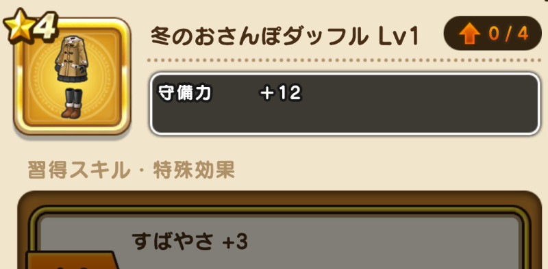 ドラクエウォークの防具「冬のおさんぽダッフル」の評価や習得スキル・特殊効果をまとめています。