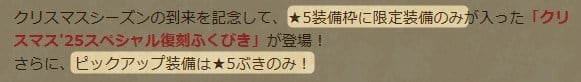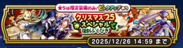 ドラクエウォークのクリスマス2025復刻ガチャ(クリスマス’25スペシャル復刻ふくびき)は引くべきか、タイミングや優先度、おすすめの武器&優先度をまとめています。提供割合や確率も掲載していきますので、どれを引くか迷った方は参考にしてください。