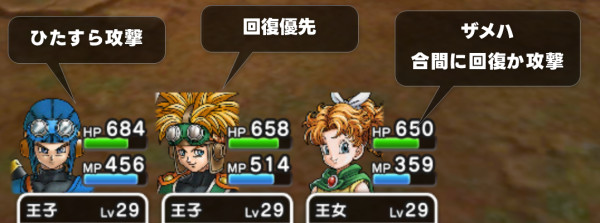 基本的にローレシアの王子が攻撃、サマルトリア王子は「ホイミ」による回復、サマルトリア王女は「ザメハ」と回復、合間に攻撃がおすすめです。