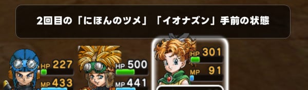 「にほんのツメ」による物理攻撃や、その次の「イオナズン」でHPを大きく削られてしまいます。ここはHPの回復に専念。特に「イオナズン」は約250程度のダメージになりますので、この前に「ぼうぎょ」しておくのも手です。