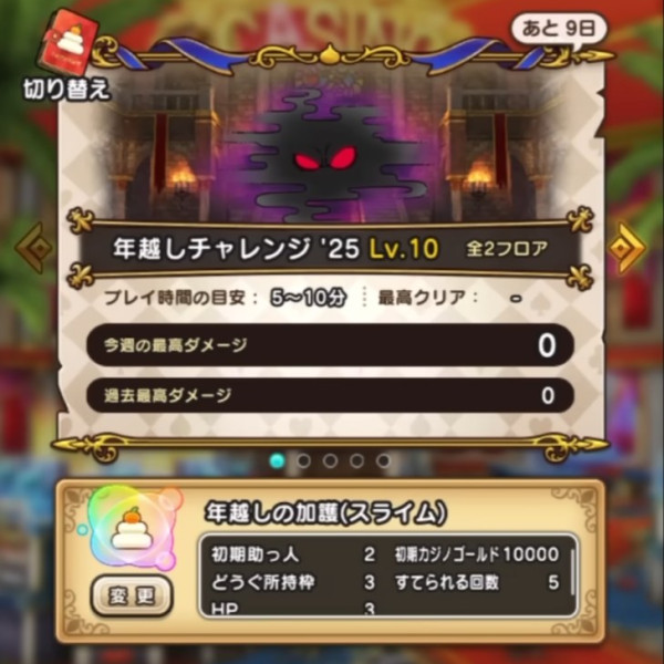 | 1 | ![]() 年越しの加護(スライム) | ・初期助っ人2 ・初期カジノゴールド10000 ・どうぐ所持枠3 ・すてられる回数5 ・HP3 【解放条件】 ・年越チャレンジ'25限定 |