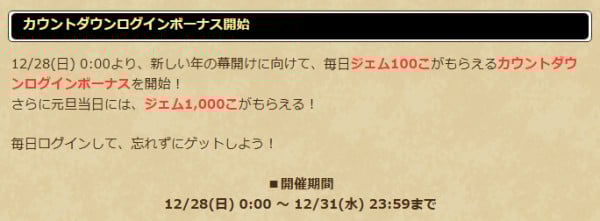 ![]() | ジェム×650個 イベントクエストクリア:50個 カウントダウンログボ28日:100個 カウントダウンログボ29日:100個 カウントダウンログボ30日:100個 カウントダウンログボ31日:100個 新春おでかけキャンペーン:100個 新春初夢プレゼントCP(もぐもぐ2回):100個 |