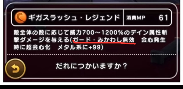 | 練度1 | ギガスラッシュ・レジェンド / 消費MP 61 敵全体の数に応じて威力700~1200%のデイン属性斬撃ダメージを与える(ガード・みかわし無効 会心発生時に超会心化 メタル系に+99) |