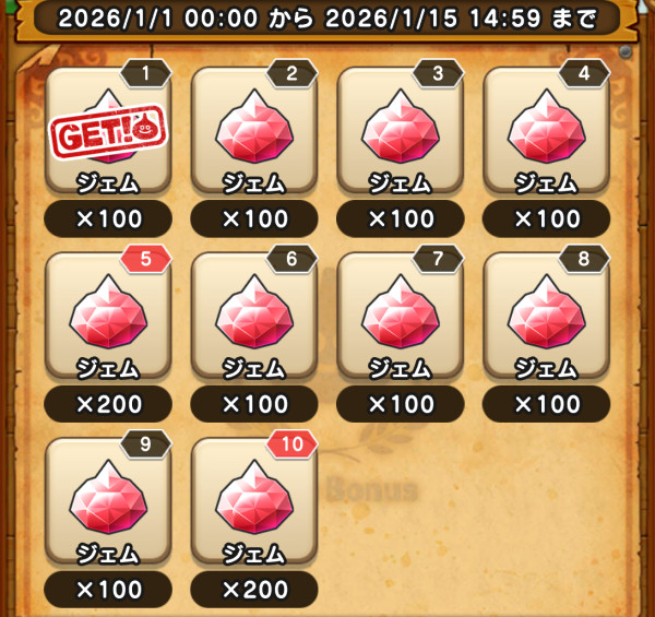 ![]() | ジェム×3790個 年越しカウントダウン祝!2026年:1000個 イベントログインボーナス:1200個 イベントクリア(1章):150個 強敵「はつゆめポーン」討伐報酬:200個 図鑑埋め(2体):40個 各特級職レベル90報酬:合計450個 冒険ランク報酬(Lv190→200):500個 おでかけランク報酬(Lv100→105):250個 記念パスミッション:合計3000個 ※要課金 ※上記のジェム合計に含めていません |