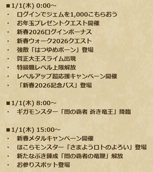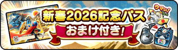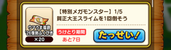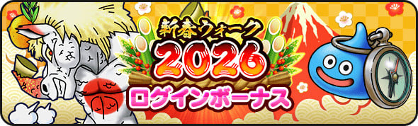 ![]() | ウマうま福袋'26復刻ふくびき補助券×200枚 お年玉クエストクリア報酬:100枚 賀正大王スライム討伐報酬:100枚 |