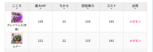 | さいだいMP「100」以上 さいだいHP「50」以上 すばやさ「50」以下 コスト「100」以下 | さいだいHP「100」以上 こうげき魔力「55」以上 ちから「20」以下 かいふく魔力「25」以下 |