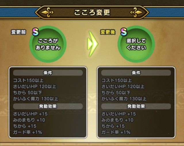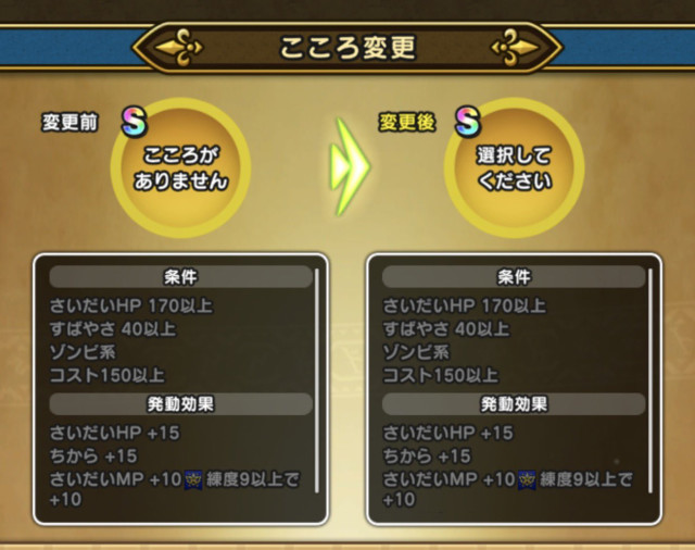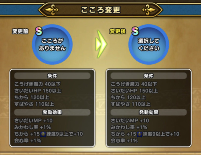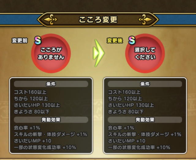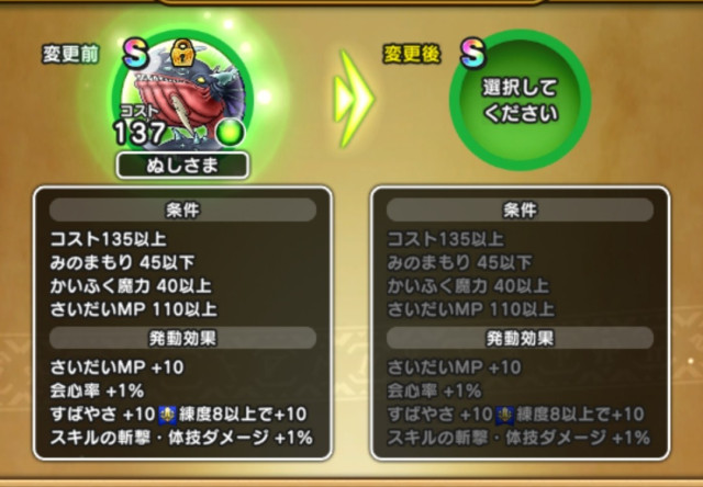 | さいだいMP+10 会心率+1% すばやさ+10【バトマス】練度8以上で+10 スキルの斬撃・体技ダメージ+1% | ちから+15 すばやさ+10 さいだいHP+15【スパスタ】練度8以上で+10 みかわし率+1% |