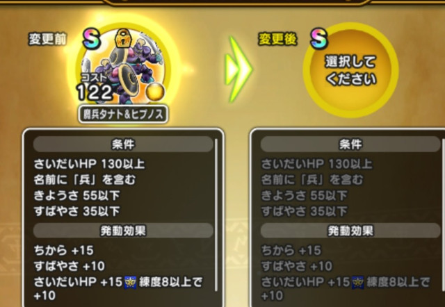 | 時間レベル上昇確率アップ ちから+15 みのまもり+10 さいだいMP+10【バトマス】練度4以上で+10 | 時間レベル下降確率ダウン さいだいHP+15 ちから+15 みのまもり+10【スパスタ】練度4以上で+10 |