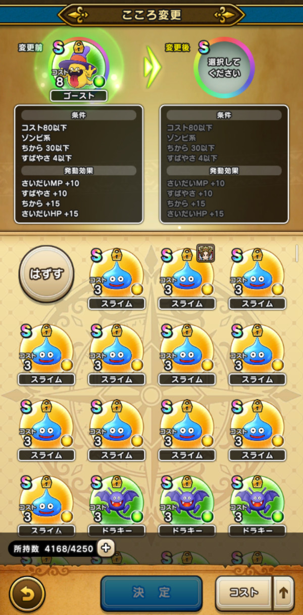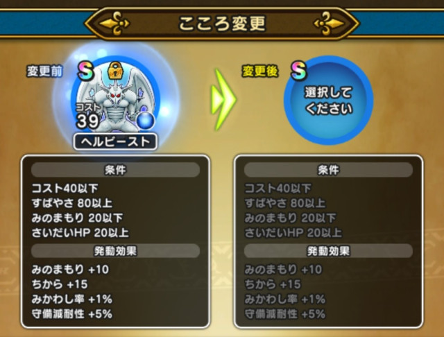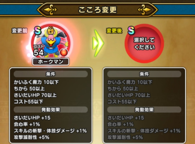 | さいだいHP「35」以上 ドラゴン系 きようさ「5」以下 みのまもり「15」以上 | コスト「140」以上 さいだいMP「50」以下 ちから「50」以上 きようさ「50」以上 |