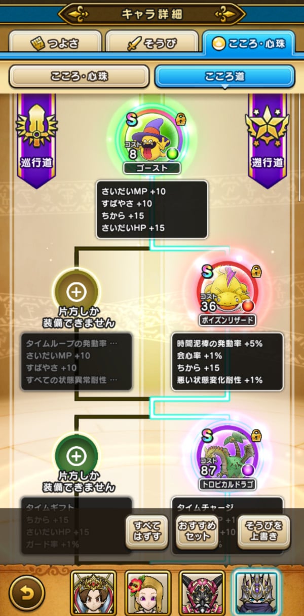 | タイムループの発動率+15% スキルの斬撃・体技ダメージ+1% すばやさ+10【バトマス】練度6以上で+10 すべての状態異常成功率+10% | 時間泥棒の発動率+5% みのまもり+10 さいだいMP+10【スパスタ】練度6以上で+10 スキルの斬撃・体技ダメージ+1% |