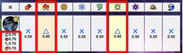 | ◎:大弱点 ◯:弱点 △:耐性 ×:極耐性(0.75倍未満に表示) -:等倍 無:無効(ゲーム内に無効表示) |