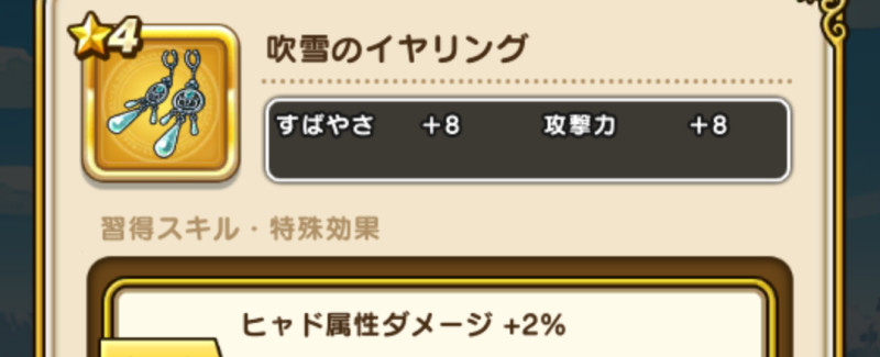 ドラクエウォークの防具「吹雪のイヤリング」の評価や習得スキル・特殊効果をまとめています。