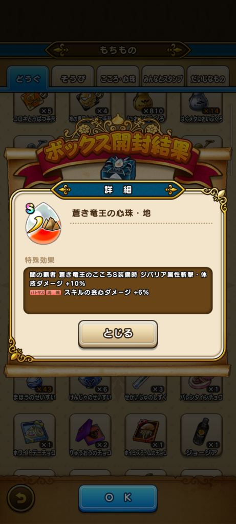 ゲットした「碧き竜王の心珠ボックス」は「もちもの」から開封ができます。
