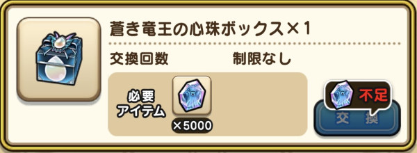 覚醒千里行「くもの大王編」で入手できる宝珠のかけら5000個と蒼き竜王の心珠ボックス1個が交換できます。