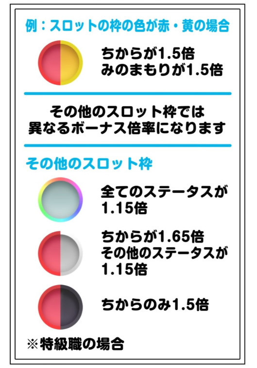 | ちから1.5倍 みのまもり1.5倍 | ちからのみ1.5倍 | ちから1.65倍 その他1.15倍 |