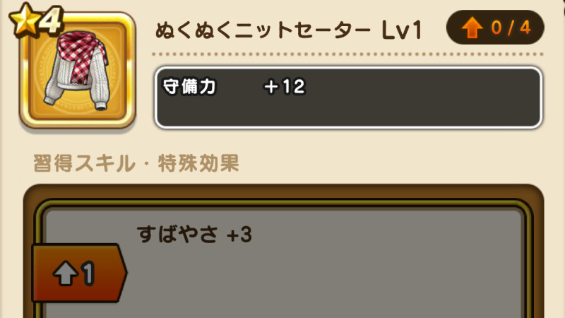 ドラクエウォークの防具「ぬくぬくニットセーター」の評価や習得スキル・特殊効果をまとめています。