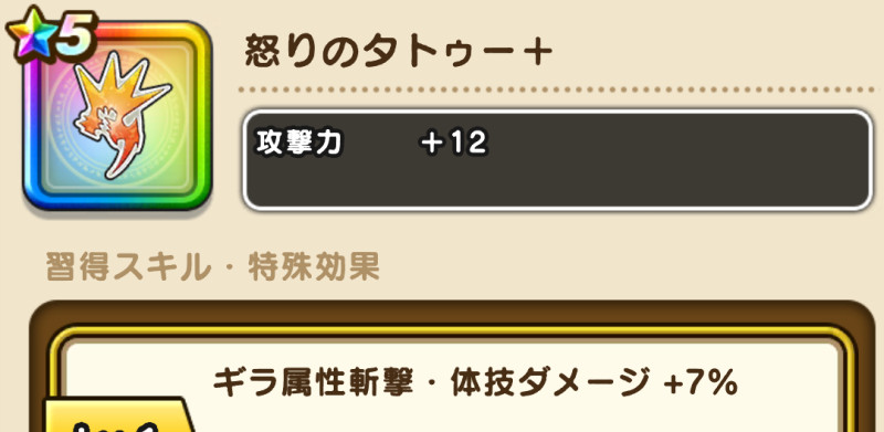 ドラクエウォークの防具「怒りのタトゥー+」の評価や習得スキル・特殊効果をまとめています。