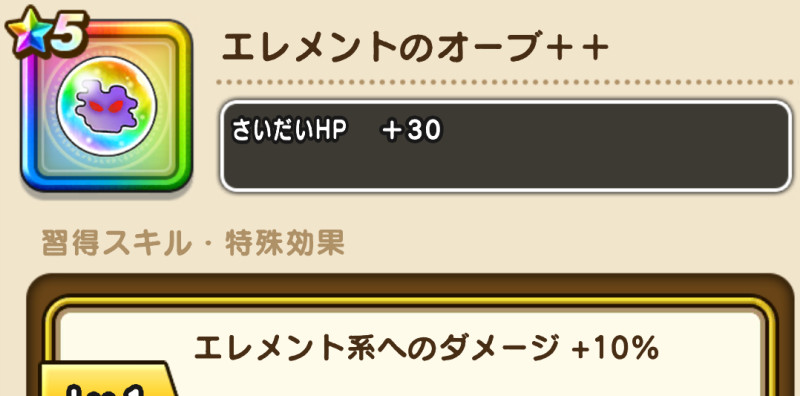 ドラクエウォークの防具「エレメントのオーブ++」の評価や習得スキル・特殊効果をまとめています。
