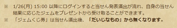2026/1/26(月)15:00以降にログインすると演出が流れ、当選結果に応じたジェムがプレゼントボックスへ送られます。確認できない場合は、一度タイトル画面へ戻りましょう。