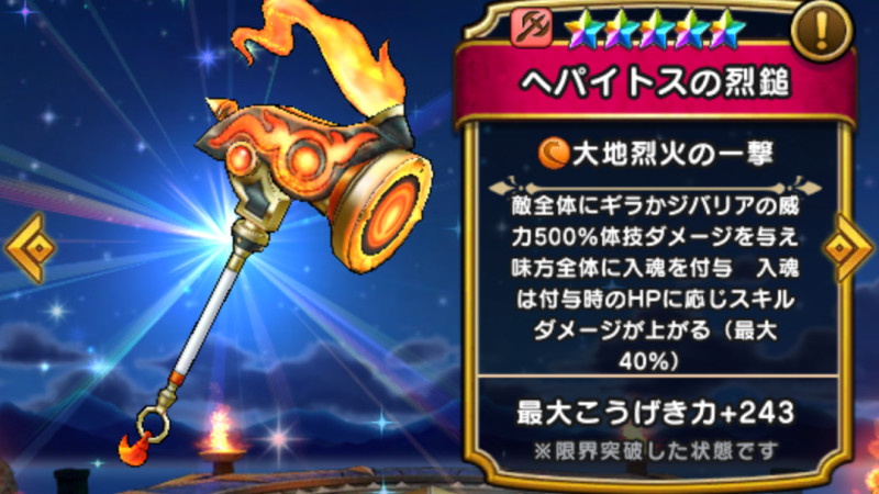ドラクエウォークの新武器「ヘパイトスの烈鎚」の特徴(入魂・超入魂・鍛冶師の心鉄・研磨の心得・熱いうちに打て・魔除けの冶金)についてまとめています。他武器の類似スキルとの比較や活用方法などを掲載しています。