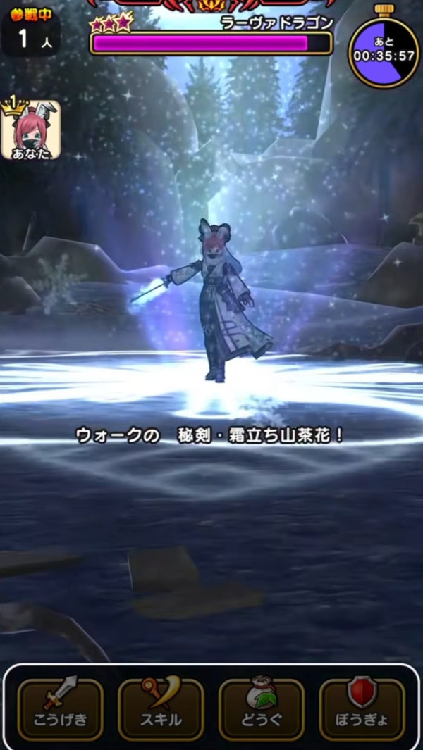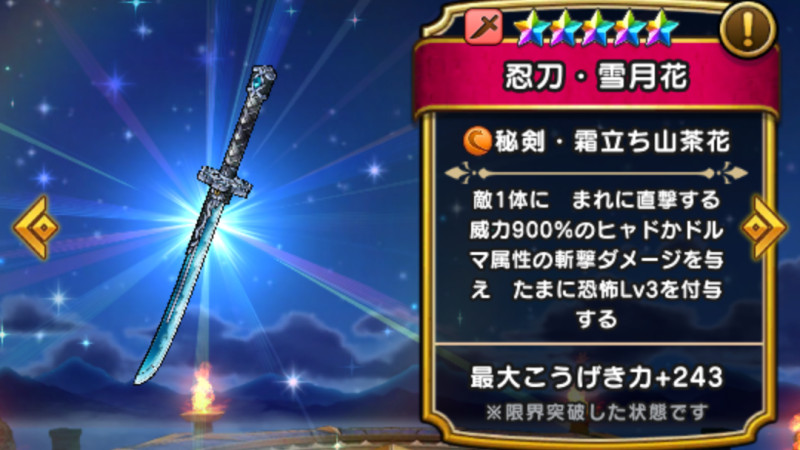 | Lv30 | 秘剣・霜立ち山茶花 / 消費MP 61継承可 敵1体に まれに直撃する 威力900%のヒャドかドルマ属性の斬撃ダメージを与え たまに恐怖Lv3を付与する |
