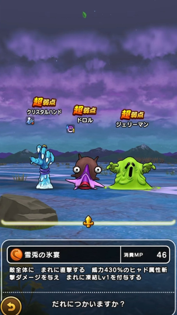 ランダムな敵に、恐怖Lv1とヒャドバーストをそれぞれ1回ずつ付与できます。しかし、ランダム要素がありますのでご注意ください。