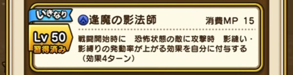 | Lv50 | 逢魔の影法師 / 消費MP 15 戦闘開始時に 恐怖状態の敵に攻撃時 影縫い・影縛りの発動率が上がる効果を自分に付与する(効果4ターン)【いきなり】 |