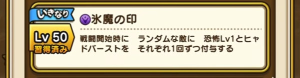 | Lv50 | 氷魔の印 / 消費MP 最大MP1% 戦闘開始時に ランダムな敵に 恐怖Lv1とヒャドバーストを それぞれ1回ずつ付与する(効果2ターン)【いきなり】 |