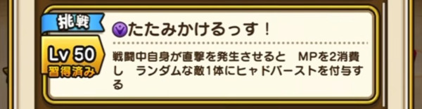 | Lv50 | たたみかけるっす! / 消費MP 2 戦闘中自身が直撃を発生させると MPを2消費し ランダムな敵1体にヒャドバーストを付与する【挑戦】 |