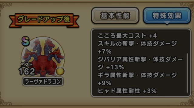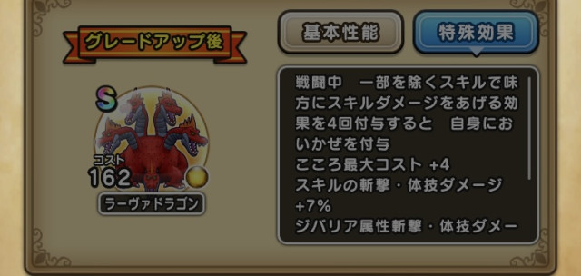 | 戦闘中一部を除くスキルで味方にスキルダメージをあげる効果を4回付与すると自身においかぜを付与 こころ最大コスト+4 スキルの斬撃・体技ダメージ+7% ジバリア属性斬撃・体技ダメージ+13% ギラ属性斬撃・体技ダメージ+9% ヒャド属性耐性+3% | ||||