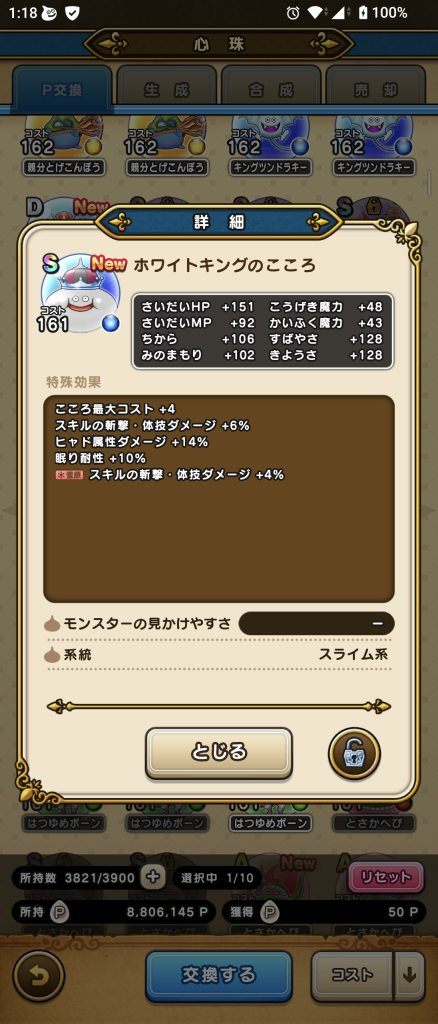 ドラクエウォークの「ホワイトキングのこころ」の性能・ステータス順位、必要個数を掲載!心珠ポイントへの交換効率や出現場所などもまとめていますので参考にしてください。