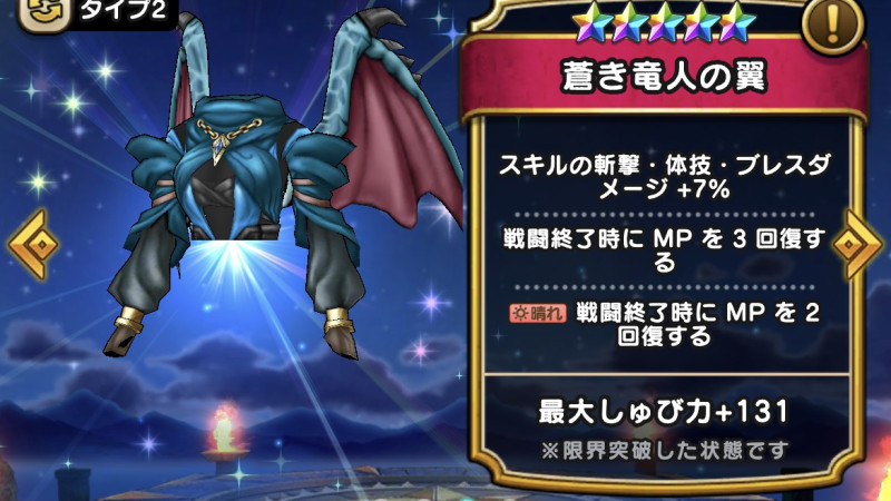ドラクエウォークの防具「蒼き竜人の翼」の評価や習得スキル・特殊効果をまとめています。