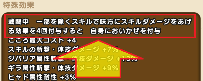 「スキルダメージUP効果を味方に4回付与」すると自身においかぜが付与される、補助役の耐久面を強化する効果です。
